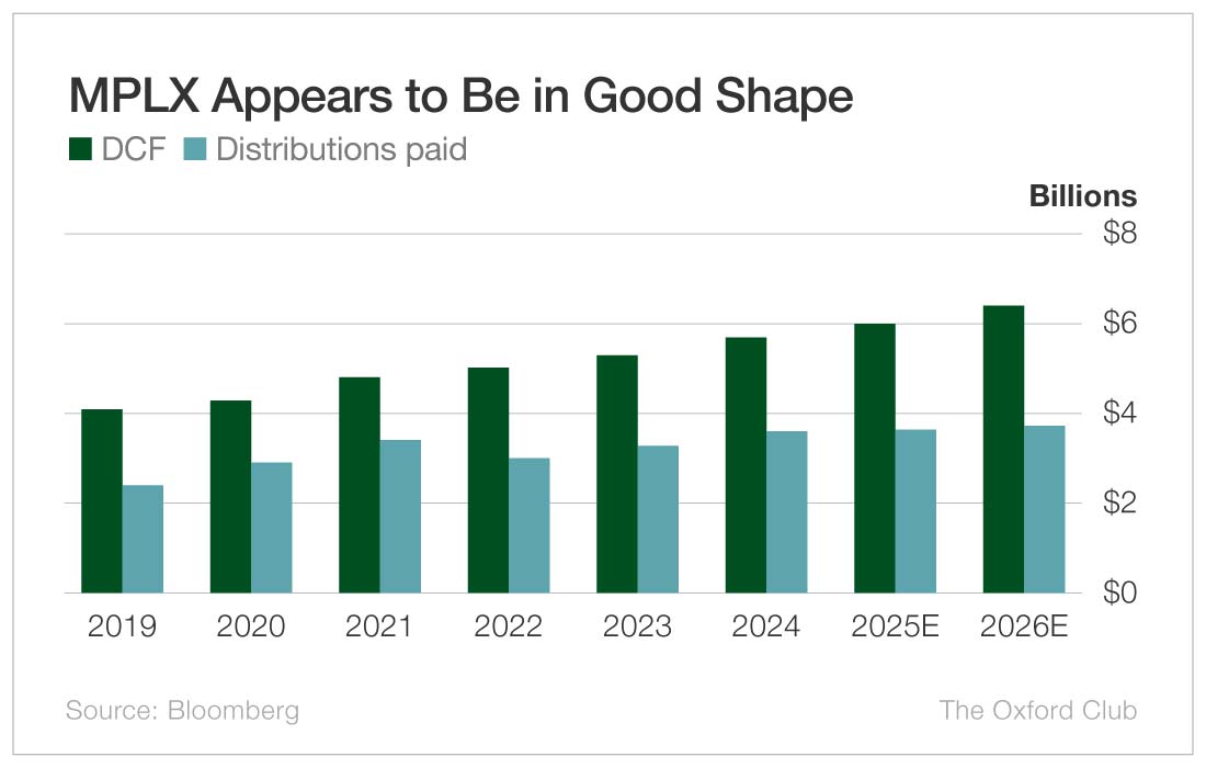 Last year, MPLX’s DCF totaled $5.7 billion. This year, it’s expected to come in at $6 billion. In 2026, DCF is forecast to grow another 6% to $6.4 billion.